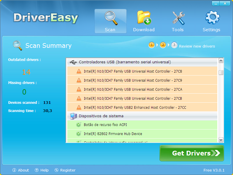 7. Para baixar os drivers atualizados, ou que estiverem em falta, é mais fácil ainda. Basta clicar no botão inferior direito Get Drivers.
