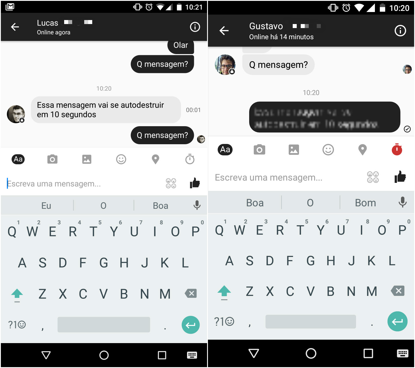 Ao enviar uma mensagem autodestrutiva, você verá uma contagem regressiva ao lado do texto na janela de conversa. Uma animação fará a mensagem “explodir” quando o tempo acabar e seu contato não poderá vê-la mais. O timer começa a correr assim que seu amigo visualiza o texto pela primeira vez.